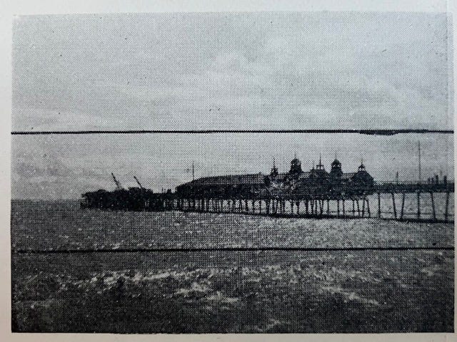 “HECTOR - We publish this as an example of what not to do, and yet what is constantly being done. There could be nothing more abominable than a pleasure pier at low tide (unless, perhaps, it is the same pier at high tide), especially when taken on the ordinary plate, which on account of its squareness means that the pier, if any fair quantity of it is included, comes out as a narrow strip in the midst of a waste of cloud and sand. … The only way out of the matter if a pier must be photographed, is to make a long, narrow picture of it, waiting, if possible until the sun is directly behind it and partly hidden in clouds, so as to get a silhouette night effect. This being done, the trimming knife must be used until practically only the portions we indicate are retained, then the best is made of a bad job. Our advice, however, is to leave these company-promoted structures alone, and go in for Nature pure and simple.”